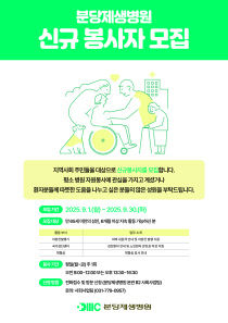 분당제생병원에서는 내원객의 의료서비스 이용 편의를 돕고 지역 주민들의 의미 있는 여가선용, 공동체 문화 확산을 위해 신규 자원봉사자를 모집 중이다고 22일 밝혔다. 활동 전 자원봉사 기본교육을 받을 수 있는 정기모집은 9월 1일부터 30일까지 한 달간 실시되며, 봉사활..