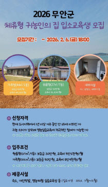 전남 무안군이 귀농을 준비하는 도시민들의 안정적인 농촌 정착을 지원하기 위해 '무안군 체류형 귀농인의 집' 입소 교육생을 모집하고, 신청을 오는 2026년 2월 6일까지 접수한다. '무안군 체류형 귀농인의 집'은 무안군으로 귀농을 희망하는 만 65세 이하 도시민을 대상..
