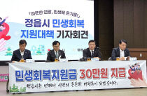 이학수 정읍시장과 박일 정읍시의회 의장이 지난 15일 시청 대회의실에서 기자회견을 열고, 모든 시민에게 1인당 30만 원의 '민생회복지원금'을 지급한다고 밝혔다. 정읍시와 정읍시의회는 장기화된 경기 침체로 어려움을 겪는 시민들의 생활 안정을 위해 다시 한번 뜻을 모았다..
