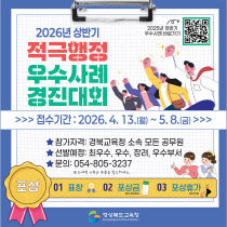 경북교육청이 능동적이고 창의적인 공직문화 조성을 위해 적극행정 우수사례 발굴에 나선다. 경북교육청은 15일 2026년 상반기 적극행정 우수 사례 경진대회를 개최하고 오는 5월 8일까지 사례를 접수한다고 밝혔다. 이번 대회는 공무원들의 적극행정 실천 사례를 발굴·공유해..