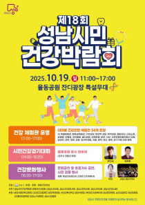 '제18회 성남시민 건강박람회'가 19일 오전 11시~오후 5시 율동공원 잔디광장에서 '성남시민 건강 박람회'가 개최된다고 15일 밝혔다. 이번 행사는 성남시민건강박람회 공동추진위원회가 주관으로 시민의 건강 증진을 위해 주제별 34개의 건강 관련 체험관, 걷기대회, 초..