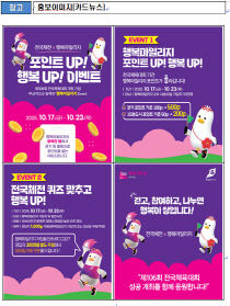 부산시가 제106회 전국체육대회 개최를 기념해 부산이즈굿 동백전 '행복마일리지' 특별 이벤트인 '포인트 업(UP)! 행복 업(UP)!'을 오는 17일부터 23일까지 7일간 추진한다고 밝혔다. 이벤트는 행복마일리지 2차 시범 사업 참여자 10만 명과 일반 시민을 대상으로..