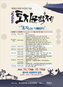 경남 하동군이 후원하고 토지문학제운영위원회가 주최·주관하는 '2025 토지문학제'가 10월 13일부터 19일까지 악양 평사리 최참판댁 일원에서 열린다. '『토지』는 아름답다'라는 슬로건 아래 펼쳐지는 이번 행사는 내년 박경리 선생 탄생 100주년을 앞두고, AI 시대에..