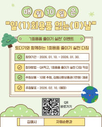 김해시는 생활 속 자원순환 실천을 확산하기 위해 매월 10일을 '일(1)회용품 없는(0) 날'로 지정하고 다양한 프로그램을 운영한다. 시는 1회용품의 '1'과 없다는 의미의 '0'을 조합해 매월 10일을 캠페인 날로 정했다. 이를 통해 일상에서 1회용품 사용을 줄일 수..