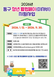 인천시 동구는 청년의 주거비 부담 완화와 안정적인 정착을 위한 '2026 청년 웰컴페이(이사비) 지원사업'을 추진한다고 8일 밝혔다. 지원대상은 2025년 11월 1일 이후 동구에 전입신고를 완료한 19~39세 무주택 세대주로서 가구당 건강보험료 기준 중위소득 150%..