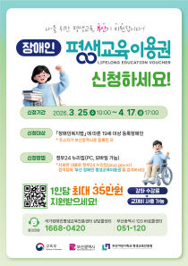부산시가 사회·경제적 여건에 따른 교육 격차를 해소하기 위해 저소득층과 장애인, 전국 최초로 도입한 끼인세대 등 성인 7501명에게 평생교육비를 지원한다. 부산시는 배움의 기회를 넓히고 교육 사각지대를 해소하고자 오는 25일부터 '2026년 부산광역시 평생교육이용권'..