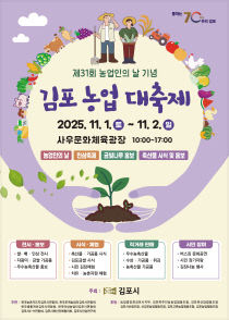 김포시가 오는 11월 1일부터 2일까지 사우문화체육광장에서 '제31회 농업인의 날 기념 김포농업 대축제'를 개최한다. 이번 행사는 '오늘을 심어 내일을 키우는 通(통)하는 김포농업'을 주제로, 제31회 농업인의 날 기념식, 인삼축제, 금빛나루행사, 축산물 시식 및 홍보..