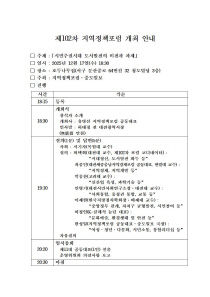 제102차 지역정책포럼(공동대표 안기돈 충남대 교수, 한성일 중도일보 국장, 유병선 대전연구원 책임연구위원)이 중도일보(회장 김원식, 사장 유영돈)와 공동주최로 ‘시민주권시대 도시발전의 비전과 과제’를 주제로 열린다. 12월 17일 오후 6시30분 호두나무집에서 열리는..