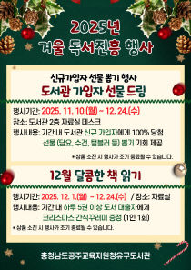 공주교육지원청유구도서관(관장 조은숙)은 11월 10일부터 12월 24일까지 책과 함께 따뜻한 겨울을 보내기 위한 '겨울 독서진흥 행사'를 운영한다. 먼저 신규 회원을 대상으로 진행되는 '도서관 가입자 선물 드림' 이벤트에서는 회원증 발급 후 뽑기를 통해 담요, 텀블러,..