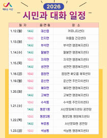 충남 서산시가 새해를 맞아 관내 15개 읍면동을 순회하며 시민의 목소리를 직접 듣는 소통 행보에 나선다. 서산시는 오는 1월 12일부터 23일까지 '2026년 시민과 대화'를 운영한다고 밝혔다. 이번 대화는 1월 12일 대산읍을 시작으로 13일 인지면·부석면, 14일..