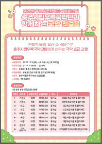 충주시립우륵국악단이 시민을 대상으로 전통음악 교육 프로그램인 '제27회 우륵당 문화학교'를 운영한다. 이번 과정은 국악 기초 이론과 실기를 병행해 우리 음악을 직접 배우고 체험할 수 있도록 마련됐다. 문화학교는 3월부터 8월까지 약 6개월간 진행된다. 강좌는 가야금,..