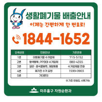 인천시 미추홀구는 주민들의 생활폐기물 배출 편의를 획기적으로 개선하기 위해 '생활폐기물 대표번호 자동응답 서비스(1844-1652)'를 3월부터 본격 시행한다고 밝혔다. 그동안 주민들은 가구·가전 등 대형폐기물 접수부터 황색 봉투(PP마대), 종량제 봉투, 음식물 쓰레..