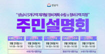 성남시(시장 신상진)는 구도심지역 (수정·중원) 생활권 재개발 후보지로 선정된 5개 구역의 정비계획 수립 및 정비구역 지정(안) 주민 의견 설명회를 개최한다고 23일 밝혔다. 이번 설명회는 25일부터 31일까지 수진2구역, 태평2·4구역, 산성구역, 단대구역, 상대원1..