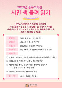 김포시 풍무도서관은 오는 4월부터 '2026년 시민 책 돌려 읽기' 독서 릴레이를 운영한다. 이웃과 책을 돌려 읽으며 자연스럽게 책 읽는 도시 문화를 만들자는 취지로 기획된 이 사업은 2007년부터 시작되어 현재까지 매년 운영되고 있다. 올해 '시민 책 돌려 읽기 지정..
