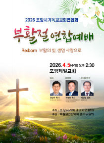 2026년 포항 부활절 연합예배가 5일 '부활의 빛, 생명 사랑으로'를 주제로 포항제일교회에서 열린다. 연합예배는 청년들이 앞장서서 섬기는 예배로 진행된다. 청년 100여 명으로 구성된 연합찬양팀이 찬양으로 시작하고 찬양으로 마무리한다. 안내도 청년들이 맡는다. 장내..