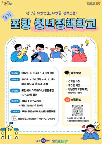 경북 포항시가 4월 29일까지 '2026년 포항 청년정책학교' 참여자를 모집한다. 프로그램은 청년이 직접 정책 아이디어를 발굴하고 구체화하는 과정을 경험할 수 있도록 설계됐다. 이를 통해 청년 참여 문화가 확산되고 민·관 협력 거버넌스가 한층 강화될 전망이다. 포항에..