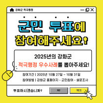 강화군은 오는 10월 27일부터 31일까지 5일간 강화군 홈페이지를 통해 '2025년 강화군 적극행정 우수사례 군민 투표'를 실시한다고 밝혔다. 이번 투표는 행정에 대한 군민의 체감도와 참여를 높이기 위해 마련된 것으로, 강화군 각 부서에서 제출한 18건의 적극행정 우..