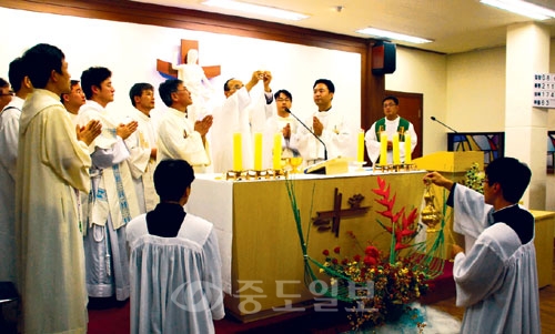 이날 중앙성당 축성식에는 150여명의 시장 상인 신자들과 법동성당 주임 황용연 신부, 교구 사목국장 임기선 신부, 임영호 국회의원, 장시성 대전시 문화체육관광국장등이 참석해 중앙시장 성당 축성식을 축하했다.