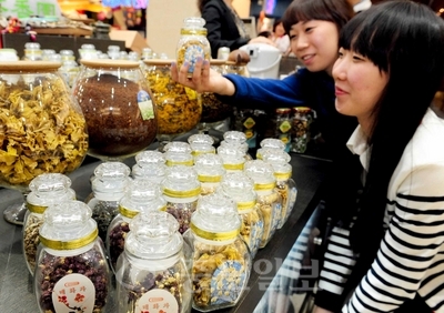 봄철 비염과 춘곤증에 좋은 목련차와 매화차가 16일 세이백화점 지하1층 식품매장에 판매돼 고객들의 눈길을 끌고 있다./손인중 기자 dlswnd98@