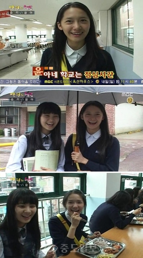 방송을 캡처한 이 사진에서 윤아는 민낯의 교복 차림으로 학생다운 수수한 스타일을 보여주고 있지만 뚜렷한 이목구비와 하얀 피부로 모태 미녀임을 자랑하고 있다.