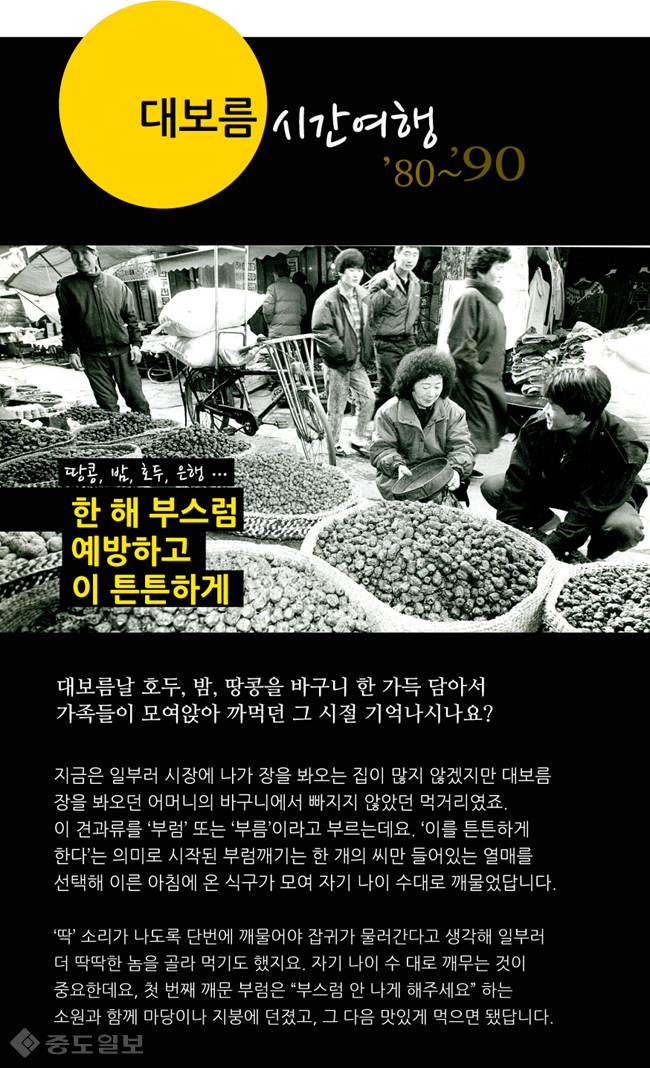 대보름날 호두, 밤, 땅콩을 바구니 한 가득 담아서 가족들이 모여앉아 까먹던 그 시절 기억나시나요? 지금은 일부러 시장에 나가 장을 봐오는 집이 많지 않겠지만 대보름 장을 봐오던 어머니의 바구니에서 빠지지 않았던 먹거리였죠.이 견과류를 ‘부럼’ 또는 ‘부름’이라고 부르는데요. ‘이를 튼튼하게 한다’는 의미로 시작된 부럼깨기는 한 개의 씨만 들어있는 열매를 선택해 이른 아침에 온 식구가 모여 자기 깨물었답니다. ‘딱’ 소리가 나도록 단번에 깨물어야 잡귀가 물러간다고 생각해 일부러 더 딱딱한 놈을 골라 먹기도 했지요. 자기 나이 수 대로 깨무는 것이 중요한데요, 첫 번째 깨문 부럼은 “부스럼 안 나게 해주세요” 하는 소원과 함께 마당이나 지붕에 던졌고, 그 다음부터는 맛있게 먹으면 됐죠.