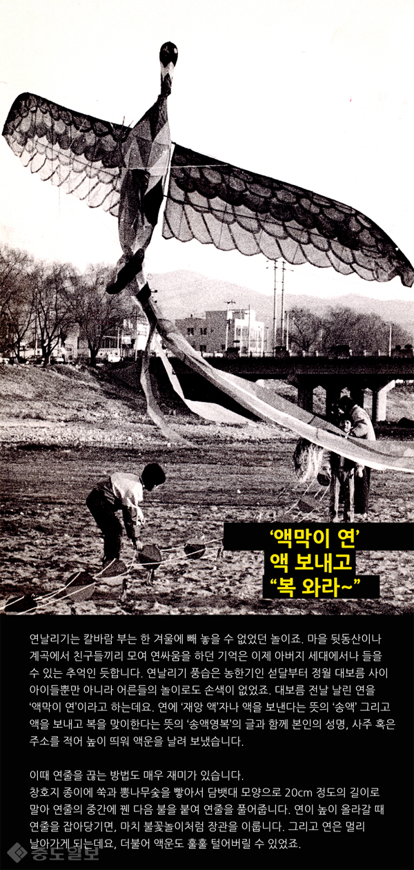 연날리기는 칼바람 부는 한 겨울에 빼 놓을 수 없었던 놀이죠. 마을 뒷동산이나 계곡에서 친구들끼리 모여 연싸움을 하던 억은 이제 아버지 세대에서나 들을 수 있는 추억인 듯합니다. 연날리기 풍습은 농한기인 섣달부터 정월 대보름 사이 아이들뿐만 아니라 어른들의 놀이로도 손색이 없었죠. 대보름 전날 날린 연을 ‘액막이 연’이라고 하는데요.연에 ‘재앙 액’자나 액을 보낸다는 뜻의 ‘송액’ 그리고 액을 보내고 복을 맞이한다는 뜻의 ‘송액영복’의 글과 함께 본인의 성명, 사주 혹은 주소를 적어 높이 띄워 액운을 날려 보냈습니다. 이때 연줄을 끊는 방법도 매우 재미가 있습니다.