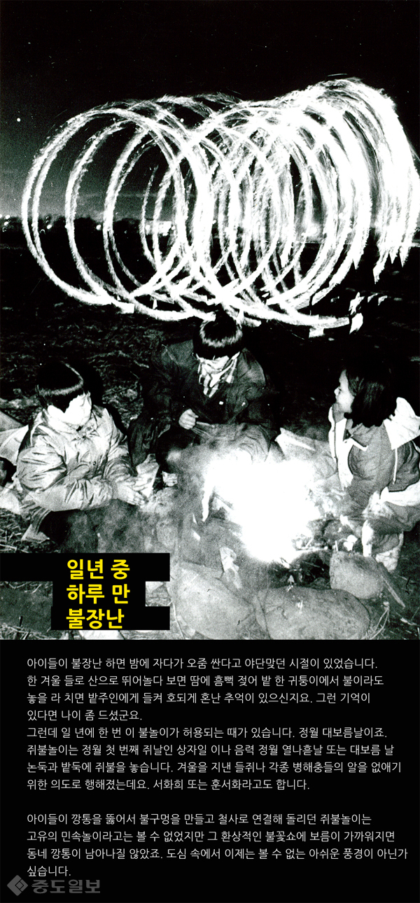 아이들이 깡통을 뚫어서 불구멍을 만들고 철사로 연결해 돌리던 쥐불놀이는 고유의 민속놀이라고는 볼 수 없었지만 그 환상적인 불꽃쇼에 보름이 가까워지면 동네 깡통이 남아나질 않았죠. 도심 속에서 이제는 볼 수 없는 아쉬운 풍경이 됐네요.