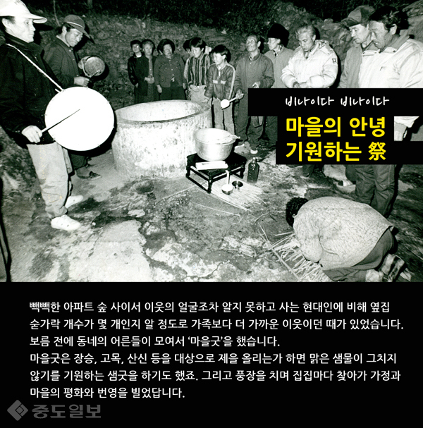 빽빽한 아파트 숲 사이에서 이웃의 얼굴조차 알지 못하고 사는 현대인에 비해 옆집 숟가락 개수가 몇 개인지 알 정도로 가족보다 더 가까운 이웃이던 때가 있었습니다. 살기 좋고 행복한 마을을 만들기 위해 보름 전에 동네의 어른들이 모여서 ‘마을굿’을 했습니다. 마을굿은 장승, 고목, 산신 등을 대상으로 제를 올리는가 하면 맑은 샘물이 그치지 않기를 기원하는 샘굿을 하기도 했죠. 그리고 풍장을 치며 집집마다 찾아가 가정과 마을의 평화와 번영을 빌었답니다.도시화 산업화로 이제 대부분 없어지거나 간소화하는 등 변화를 겪었지만, 온 동네사람들이 마을의 안녕과 풍년을 기원했던 그 마음은 길이 남기고 싶은 풍속이네요.