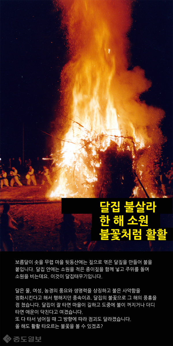대보름달이 솟을 무렵 마을 뒷동산에는 짚으로 엮은 달짚을 만들어 불을 붙입니다. 달집 안에는 소원을 적은 종이짚을 함께 넣고 주위를 돌며 소원을 비는데요. 이것이 달집태우기입니다. 달은 물, 여성, 농경의 풍요와 생명력을 상징하고 불은 사악함을 정화시킨다고 해서 행해지던 풍속이죠. 달집의 불꽃으로 그 해의 풍흉을 점 쳤습니다. 달집이 잘 타면 마을이 길하고 도중에 불이 꺼지거나 더디 타면 애운이 닥친다고 여겼습니다. 또 다 타서 넘어질 때 그 방향에 따라 점괴도 달라졌습니다. 올 해도 활활 타오르는 불꽃을 볼 수 있겠죠?#외줄타기놀이
