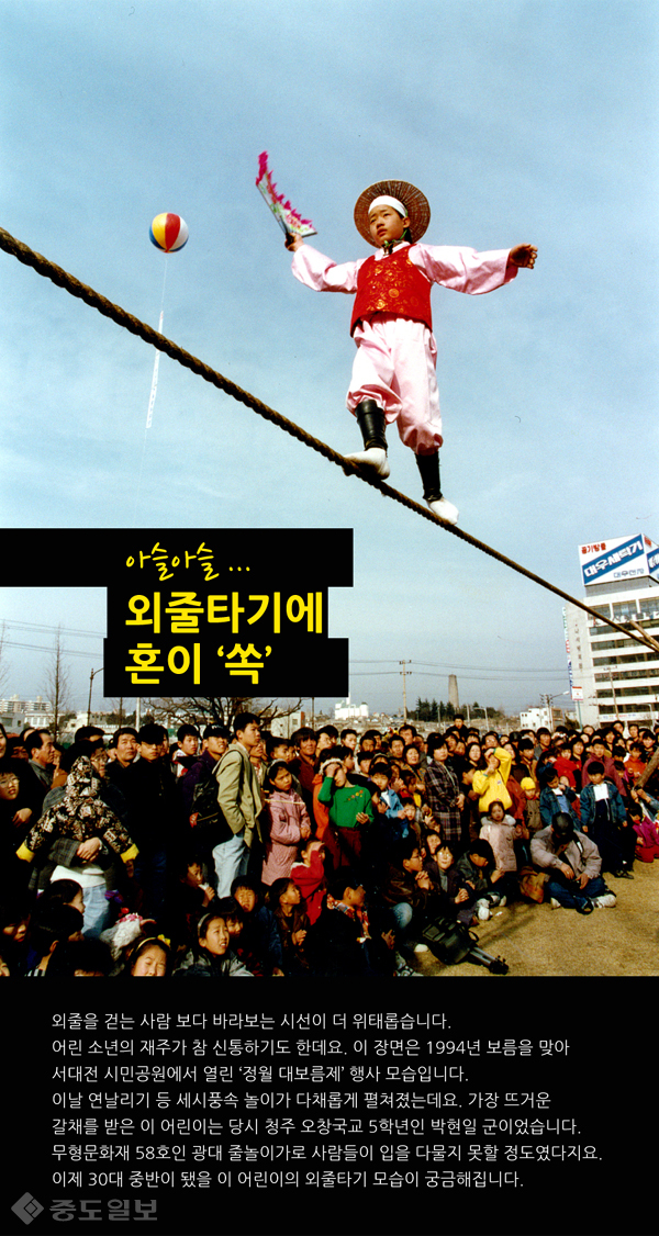 가장 뜨거운 갈채를 받은 이 어린이는 당시 청주 오창국교 5학년인 박현일 군이었습니다. 무형문화재 58호인 광대 줄놀이가로 사람들이 입을 다물지 못할 정도였다지요. 이제 30대 중반이 됐을 이 어린이의 외줄타기 모습이 궁금해집니다.