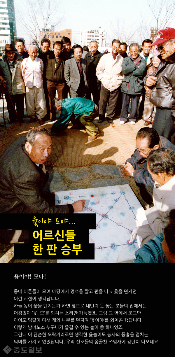 윷이야! 모다!동네 어른들이 모여 마당에서 멍석을 깔고 편을 나눠 윷을 던지던 어린 시절이 생각납니다.