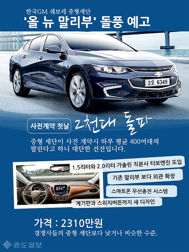 28일 한국GM에 따르면 사전계약에 들어간 올 뉴 말리부는 사전계약 첫날 계약대수 2천대를 돌파했다고 밝혔습니다. 감이 잘 오지 않는다구요? 일단 중형 세단이 사전 계약시 하루 평균 400여대씩 팔린다고 하니 대단한 선전이죠.
