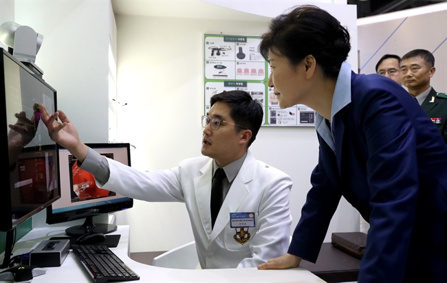 (고양=연합뉴스) 백승렬 기자 = 박근혜 대통령이 28일 경기도 고양시 킨텍스에서 열린 2016 지역희망 박람회 보건복지부 부스에서 군의 원격의료진료를 관람하고 있다. 2016.9.28