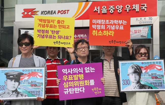 (서울=연합뉴스) 이상학 기자 = 민족문제연구소 관계자들이 29일 오후 서울 중구 서울중앙우체국 앞에서 박정희 전 대통령 기념우표 취소 촉구 기자회견을 하고 있다. 우정사업본부는 오는 9월 박 전 대통령 탄생 100주년 기념우표를 발행할 계획이다. 2017.6.29