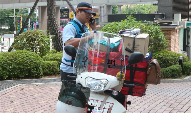 (화성=연합뉴스) 강영훈 기자 = 지난 26일 오전 경기도 화성시 동탄신도시의 한 아파트에서 집배원 박혜관(41)씨가 우편물을 전달한 고객과 전화 통화를 하고 있다. 2017.6.30