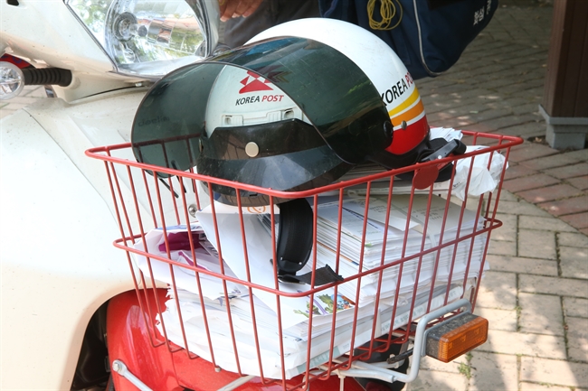 집배원 헬맷 밑에 가득한 우편물