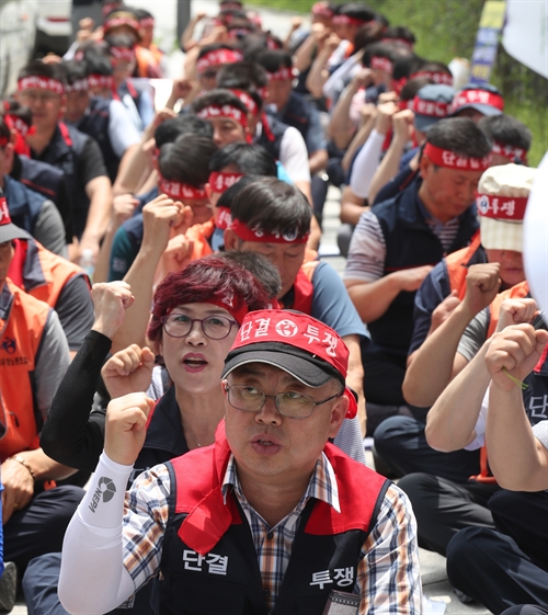 (세종=연합뉴스) 이진욱 기자 = 전국우정노동조합 소속회원들이 5일 오전 정부세종청사 우정사업본부 앞에서 노동조건 즉각 개선을 요구하며 시위를 벌이고 있다. 2017.7.5