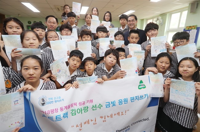 (전주=연합뉴스) 임채두 기자 = 김병수 전북지방우정청장과 전주교육대학교 전주부설초등학교 학생들이 6일 오전 '2018 평창 동계올림픽대회'에 출전하는 쇼트트랙 국가대표 김아랑 선수의 선전을 기원하는 편지 쓰기 행사를 한 뒤 기념촬영을 하고 있다. 2017.7.6