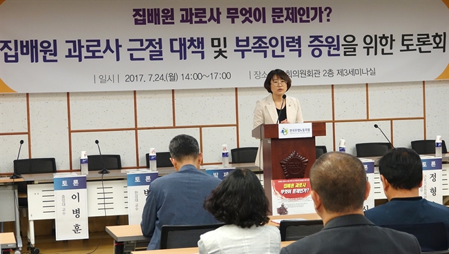 (서울=연합뉴스) 백승렬 기자 = 정의당 추혜선 의원이 24일 오후 국회 의원회관에서 `집배원 과로사 무엇이 문제인가?' 주제로 열린 `집배원 과로사 근절 대책 및 부족인력 증원을 위한 토론회'에서 축사하고 있다. 2017.7.24
