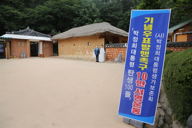 (구미=연합뉴스) 박정희대통령생가보존회가 25일 박정희 전 대통령 탄생 100돌 기념우표 발행을 촉구하는 10만명 서명운동에 들어갔다. 박 전 대통령 생가 입구에 서명운동을 알리는 현수막이 있다. 2017.7.25 [구미시 제공=연합뉴스]