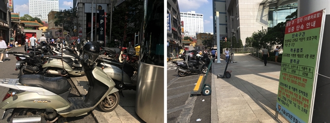 (서울=연합뉴스) 권영전 기자 = 지난 4일 오후 서울 중구 서울중앙우체국 앞 도로에 오토바이들이 무더기로 불법주차를 하고 있다. 그 옆으로 경찰의 불법주차 단속 안내 입간판이 보인다. 2017.8.6