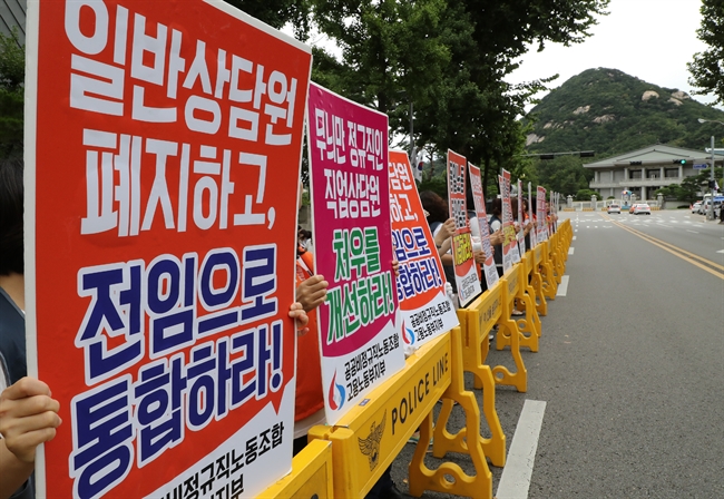 (서울=연합뉴스) 김주형 기자 = 공공연대노동조합 고용노동지부 조합원들이 16일 오전 청와대 앞 분수대 인근에서 '일반상담원 폐지와 전임과의 통합'을 촉구하는 집회를 하고 있다. 2017.8.16