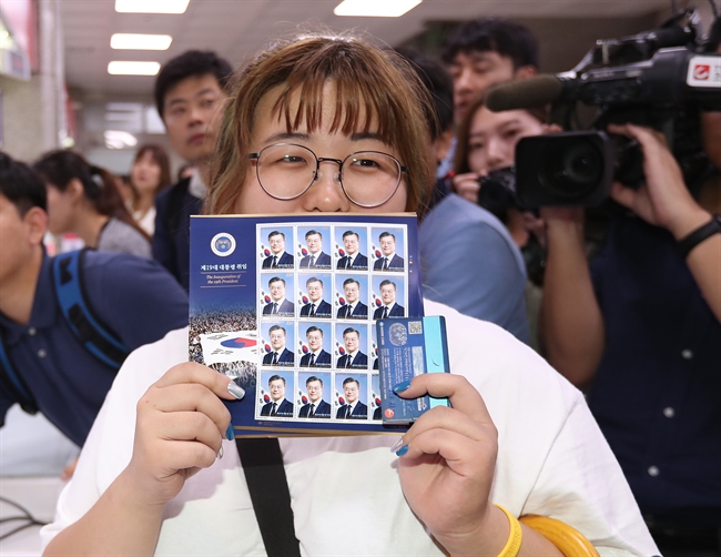 우정사업본부는 이날부터 문 대통령의 어린시절 모습, 노무현 전 대통령과 나란히 서 있는 모습, 대통령 취임식 장면 등이 담긴 기념우표를 판매한다. 가격은 우표 330 원, 시트 420 원, 기념우표첩 2만3천 원이다.