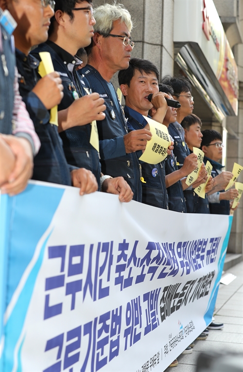(서울=연합뉴스) 김주형 기자 = 민주노총 공공운수노조 전국집배노동조합 관계자들이 1일 오후 서울 종로구 광화문 우체국 앞에서 '근무시간 축소·조작·반려 우정사업본부 규탄, 근로기준법 위반 고발!' 집배 노동자 기자회견을 하고 있다. 2017.9.1