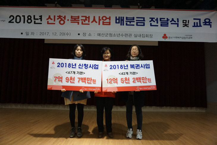 이날 행사에서는 2018년 신청사업 수행기관 67개소에 7억9700만원, 2018년 복권사업 수행기관 42개소에 12억 5200만원이 전달됐다.