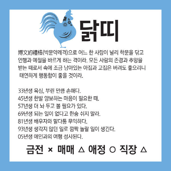 博文約禮格(박문약례격)으로 어느 한 사람이 널리 학문을 닦고 언행과 예절을 바르게 하는 격이라. 모든 사람의 존경과 추앙을 받는 때로서 속에 조금 남아있는 아집과 고집은 버려도 좋으리니 태연하게 행동함이 좋을 것이라.