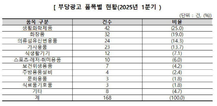 생활화학제품과 의류·섬유·신변용품은 친환경 오인 표현이 많았고 화장품은 의학적 효능 오인 표현이 대다수를 차지했다. 가사용품에서는 성능 허위·과장 광고와 부당 비교 건수가 절반 이상이었다. 표시광고법 제3조와 관련 지침에 따르면 '친환경'이나 '무독성' 또는 이와 유사한 환경적 표현을 사용하려면 범위를 분명히 하고 실증할 수 있는 객관적인 근거가 있어야 한다.