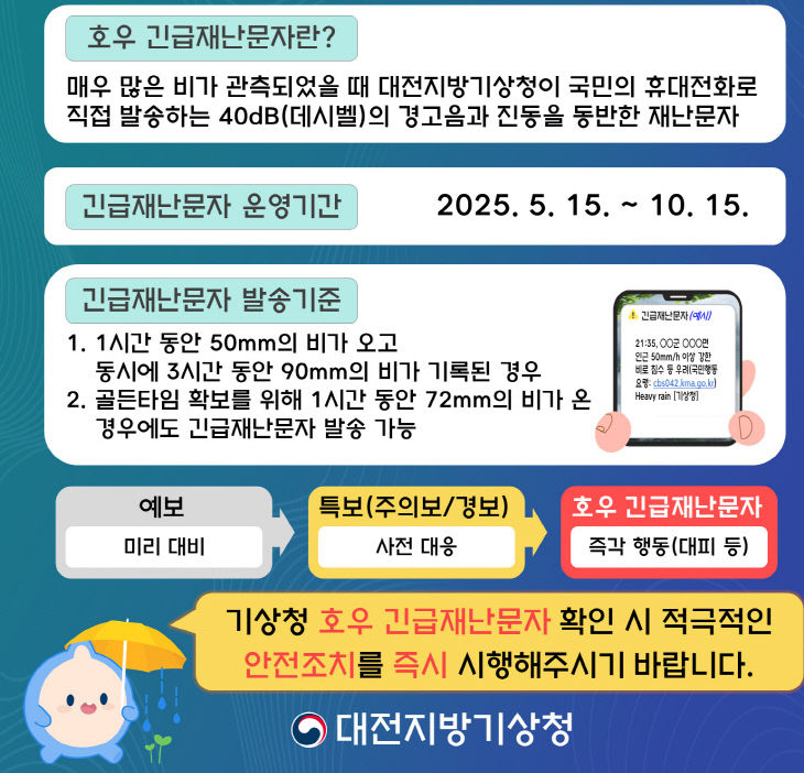 대전기상청 관계자는 "매우 많은 비가 관측됐을 때 국민의 휴대폰으로 재난 문자를 직접 발송할 예정으로, 문자 수신 시 적극적인 안전조치를 즉시 시행해주기를 부탁드린다"고 설명했다.