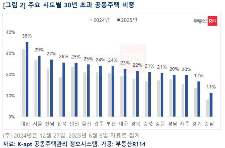 | 시도별 30년 초과 공동주택 비중. 사진=부동산R114 제공 |